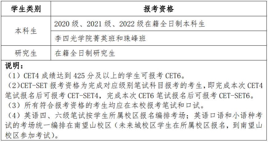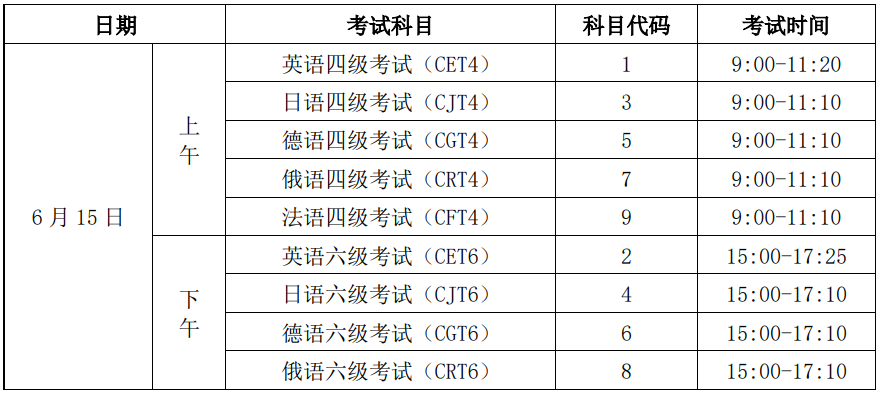 2024年上半年全国大学英语四、六级考试口试(以下称CET-SET)和笔试(以下称CET)将分别于5月18日至19日和6月15日举行,其中CET-SET于5月18日开考英语四级,5月19日开考英语六级;CET于6月15日上午开考英语(日语、德语、俄语、法语)四级,下午开考英语(日语、德语、俄语)六级。为确保我校报名工作顺利进行,现将有关事项通知如下: