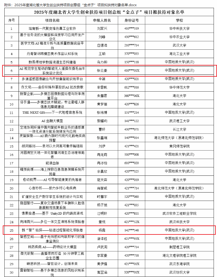 近日,2025年度湖北省大学生创业扶持项目创意组“金点子”项目名单正式公示,由伟德体育2023级硕士研究生张云豪负责的项目《AI视觉孪生驱动的智能无人遥感操作撬毛台车系统设计优化》、2023级博士生杨霄负责的项目《新“智”钻探——钻进过程智能化领航者》成功入选。